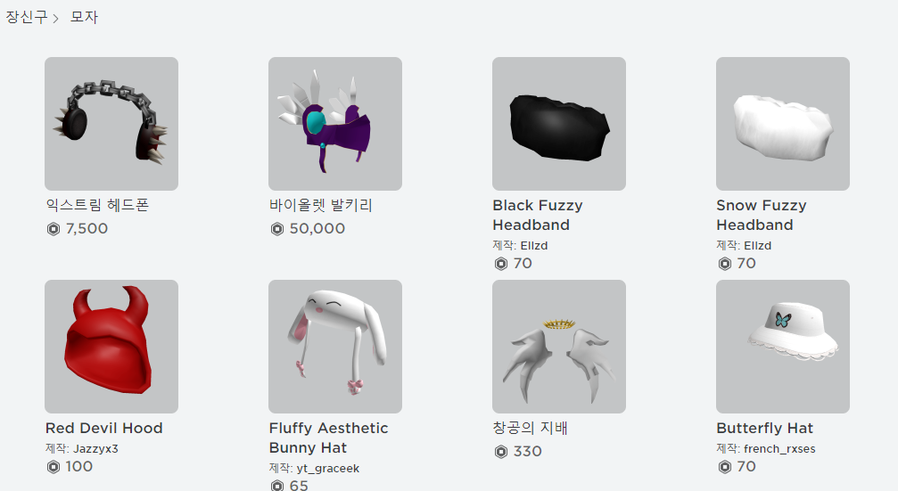 위와 같이 모자 파는 상점을 보면 아래 숫자가 로벅스인데, 바이올렛 발키리는 5만 로벅스다 -.-;