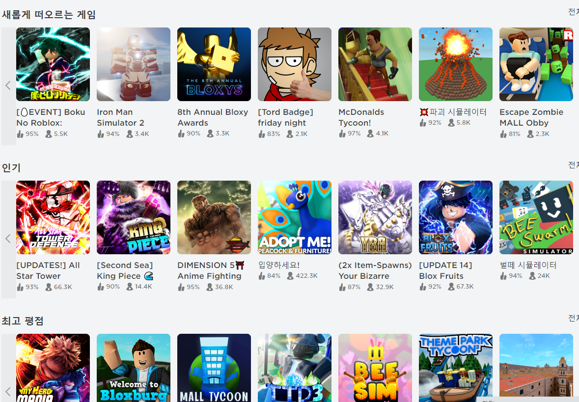 저 게임 배급업체들에서 제공하는 클라이언트를 실행하면 무지 많은 게임들이 보이고 우리는 거기서 하나를 구입해서 게임을 즐긴다. 로블록스도 비슷하다. 로블록스 회원 가입하고 맨 처음 들어가 보면 굉장히 많은 게임들이 보이고 그중 하나를 선택해 게임을 할 수 있다. 그런데 어떤 건 무료고 어떤 건 돈을 내야 한다.