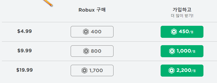 두번쨰 줄을 보면 $4.99에 400로벅스를 주거나 450로벅스를 준다고 쓰여 있는데,